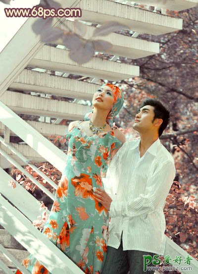 photoshop调出淡橙色效果外景情侣婚片写真照