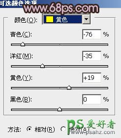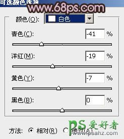 5、创建可选颜色调整图层,对黄,白进行调整,参数设置如图7,8,效果如图9。