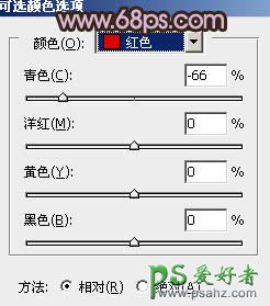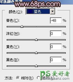 9、创建可选颜色调整图层,对红,黄,蓝进行调整,参数设置如图16 - 18,效果如图19。