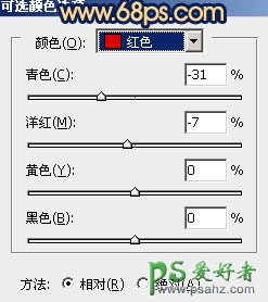 6、创建可选颜色调整图层,对红,白进行调整,参数设置如图10,11,确定后只保留人物脸部,其它部分用黑色画笔擦掉,效果如图12。