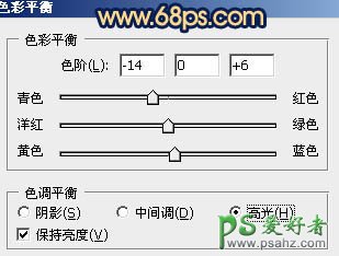 7、创建色彩平衡调整图层,对阴影及高光进行调整,参数设置如图13,14,效果如图15。