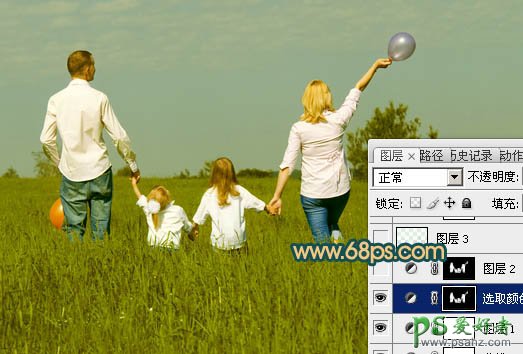 PS照片后期调色实例教程,photosho给温馨的欧美一家人外景照调出柔美的橙黄色,家庭生活照调色,原图素材中人物跟主色比较接近,主体不是很突出。处理的时候可以把人物部分稍微调亮,再把草地及天空的颜色色差拉大。这样空间感就强很多。最后还可以