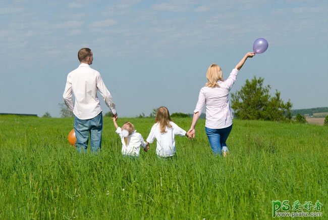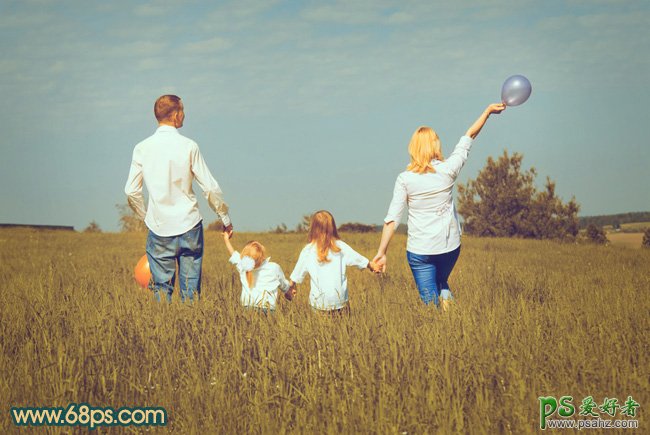 PS照片后期调色实例教程,photosho给温馨的欧美一家人外景照调出柔美的橙黄色,家庭生活照调色,原图素材中人物跟主色比较接近,主体不是很突出。处理的时候可以把人物部分稍微调亮,再把草地及天空的颜色色差拉大。这样空间感就强很多。最后还可以把边角部分压暗,可以更好的突出主体部分。