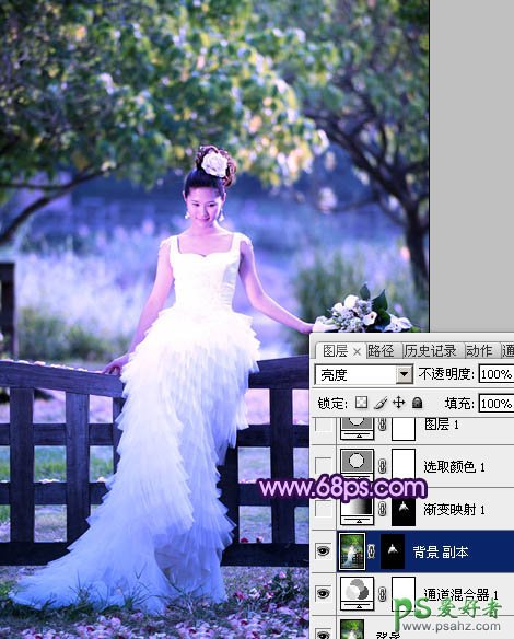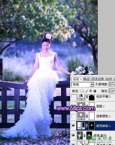 3、调成当前图层蒙版选区,创建渐变映射调整图层,颜色设置如图5,确定后把图层混合模式改为“变亮”,不透明度改为:30%,效果如图6。这一步是把人物脸部稍微调亮。