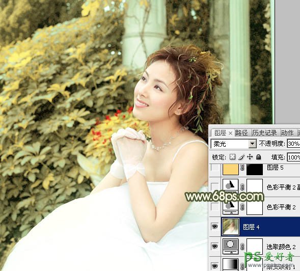 8、新建一个图层,按Ctrl + Alt + Shift + E 盖印图层。执行:滤镜 > 模糊 > 高斯模糊,数值为5,确定后把图层混合模式改为“柔光”,不透明度改为:30%,效果如下图。这一步是把图片柔化处理。