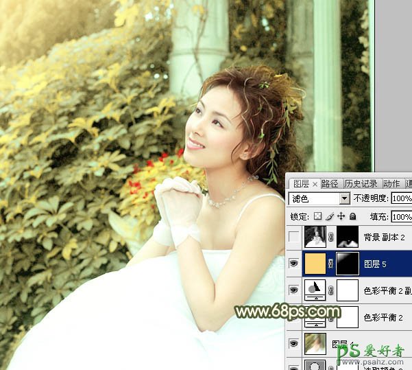 10、新建一个图层填充颜色:#FBD679,混合模式改为“滤色”,按住Alt 键添加图层蒙版,用白色画笔把左上角部分擦处理,效果如下图。这一步是给图片加上高光。