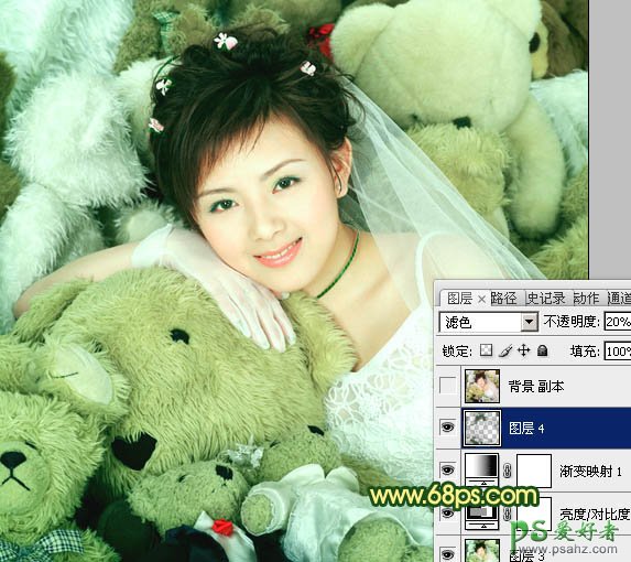 8、按Ctrl + Alt + ~ 调出高光选区,按Ctrl + Shift + I 反选,新建一个图层填充颜色:#1E430F,混合模式改为“滤色”,不透明度改为:20%,效果如下图。