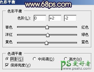 12、创建色彩平衡调整图层,对阴影,高光进行调整,参数设置如图20,21,效果如图22。