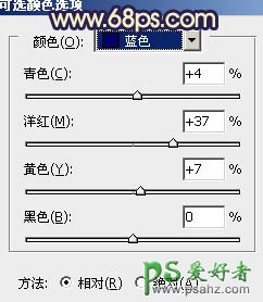 5、创建可选颜色调整图层,对蓝色进行调整,参数设置如图10,效果如图11。这一步是调整蓝色的亮度。