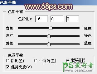 7、创建色彩平衡调整图层,对阴影,高光进行调整,参数设置如图17,18,效果如图19。