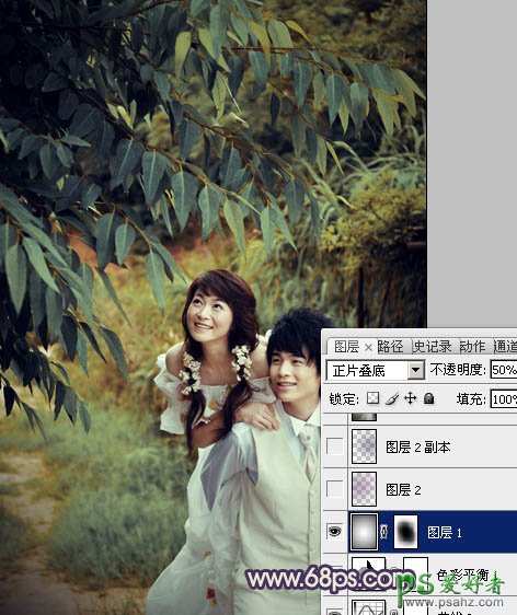 8、新建一个图层,选择渐变工具,颜色设置为黑白。然后用中心向边角拉出白色至黑色径向渐变。确定后把图层混合模式改为“正片叠底”,不透明度改为:50%。加上图层蒙版,用黑色画笔把中间部分擦出来,效果如下图。