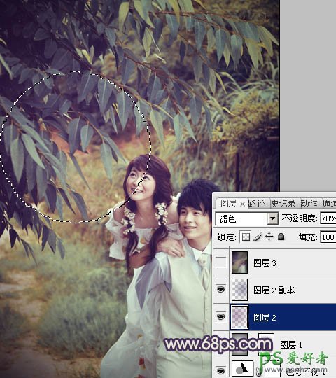 9、新建一个图层,混合模式改为“滤色”,把前几颜色设置为:#7C3C7F,用画笔把下图选区部分加上一些补色。再适当降低图层不透明度,效果如下图。