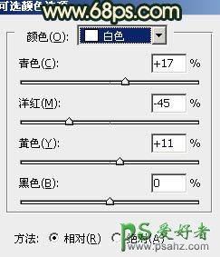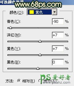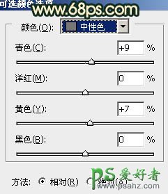 2、创建可选颜色调整图层,对黄,白,中性色进行调整,参数设置如图4 - 6,效果如图7。这一步是增加背景及人物脸部的橙色。