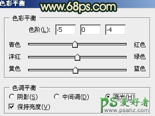 7、创建色彩平衡调整图层,对高光进行调整,参数设置如图17,确定后把图层不透明度改为:30%,效果如图18。