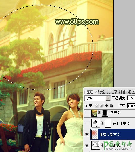12、新建一个图层,用椭圆选框工具拉出下图所示的选区,羽化120个像素后填充颜色:#D35C2F,混合模式改为“滤色”,不透明度改为:20%,如下图。