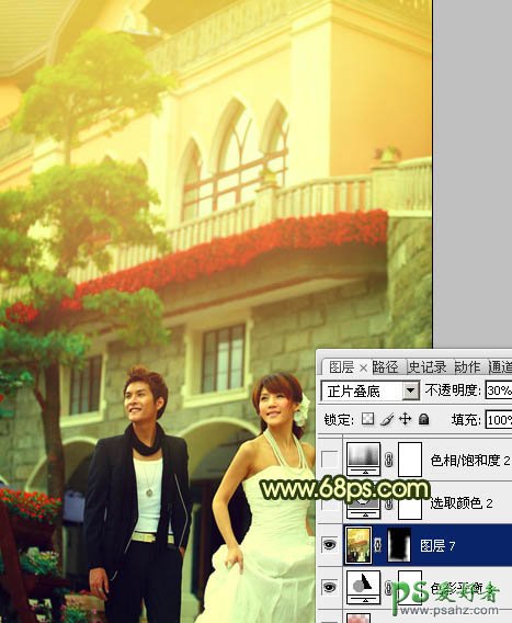 13、新建一个图层,盖印图层。混合模式改为“正片叠底”,不透明度改为:30%,按住Alt 键添加图层蒙版,用白色画笔把边缘部分擦出来,简单给图片加上暗角,效果如下图。