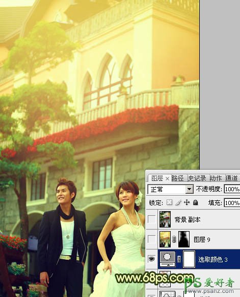 photoshop给建筑风景婚片情侣艺术照调出温馨的朝霞色