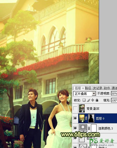 photoshop给建筑风景婚片情侣艺术照调出温馨的朝霞色
