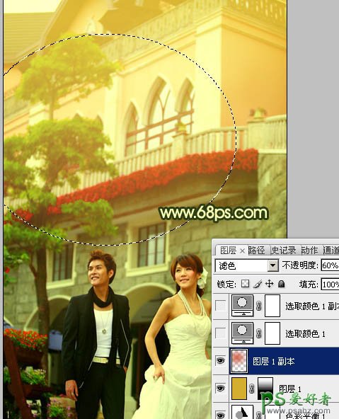 5、新建一个图层,用椭圆选框工具拉出下图所示的选区,按Ctrl + Alt + D 羽化120个像素,然后填充颜色:#D35C2F,混合模式改为“滤色”,不透明度改为:60%,效果如下图。