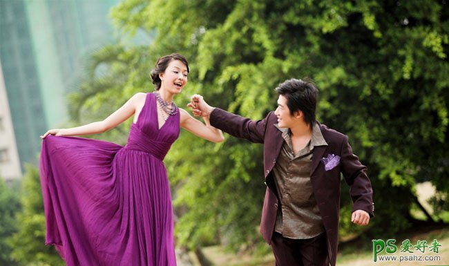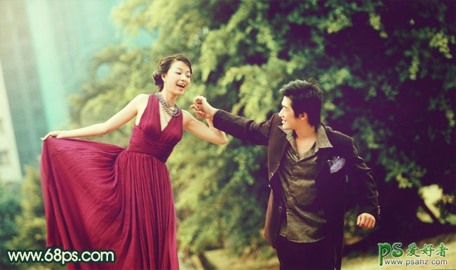 今天我们来教大家学习一篇影楼后期调色教程,PS婚片后期调色教程实例,photoshop调出柔美的青黄色情侣婚片艺术照,婚片调色可以完全按照自己的喜好选择主色,也可以按照画面中人物衣服颜色选择主色。不管用什么色调,重点是把画面中的色调搭配好,尽量做到层次分明,主体突出。
