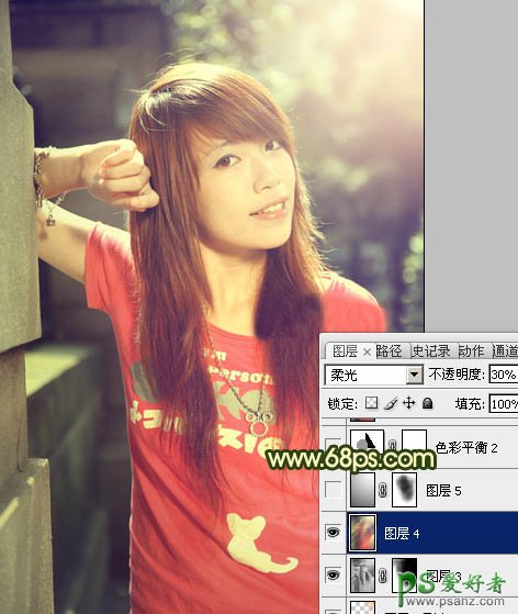 12、新建一个图层,盖印图层。执行:滤镜 > 模糊 > 高斯模糊,数值为5,确定后把图层混合模式改为“柔光”,不透明度改为:30%,效果如下图。这一步是给图片柔化处理。
