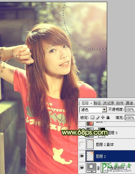 9、新建一个图层,用椭圆选框工具拉出下图所示的选区,羽化60个像素后填充颜色:#F7B071,混合模式改为“滤色”,效果如下图。这一步是给图片加上高光。