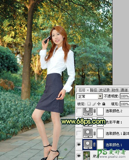 PS调色教程:给外景树林间美腿少妇调出柔美的暗青色