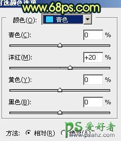 9、创建可选颜色调整图层,对红,青进行调整,参数设置如图20,21,效果如图22。