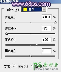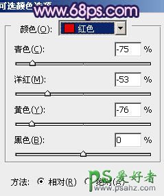 4、创建可选颜色调整图层,对红,黄进行调整,参数设置如图12,13,效果如图14。这一步简单调整树叶部分的颜色。