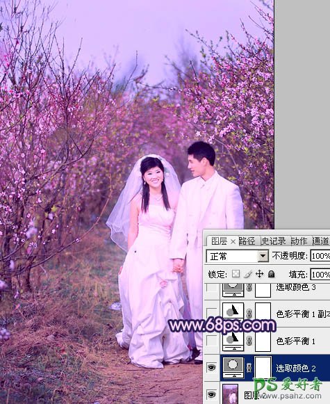 photoshop给春日桃花林里的情侣婚片调出艳丽的桃红色