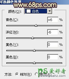 7、调出人物选区,创建可选颜色调整图层,对白色进行调整,参数设置如图13,效果如图14。到这一步人物部分调色基本完成,也可以根据自己的习惯调整。