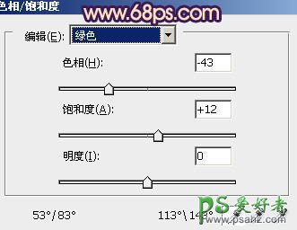 1、打开原图素材,创建色相/饱和度调整图层,选择绿色,用吸管吸取背景树叶部分颜色再调整,参数设置如图1,效果如图2。这一步是调整背景部分的颜色。