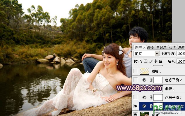 PS给水景情侣婚片写真照调出唯美的蓝红色