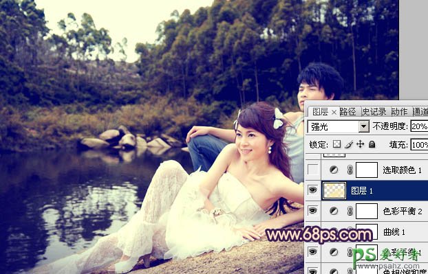 5、按Ctrl + Alt + ~ 调出高光选区,新建一个图层填充淡黄色:#F8E7A4,混合模式改为“强光”,不透明度改为:20%,效果如下图。这一步加强图片的暖色效果。