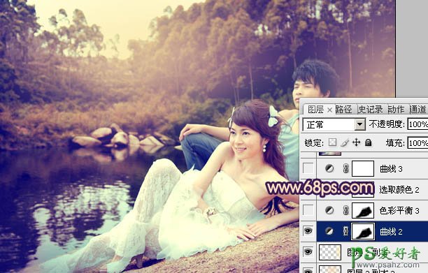 PS给水景情侣婚片写真照调出唯美的蓝红色