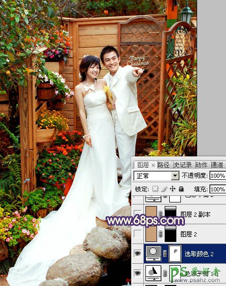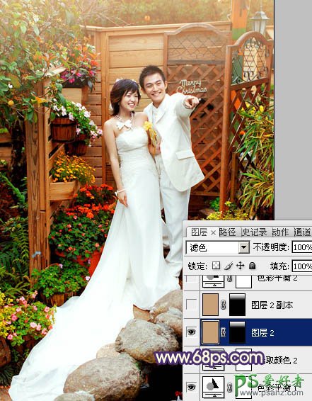 photoshop调出甜美的暖红色园林情侣婚片