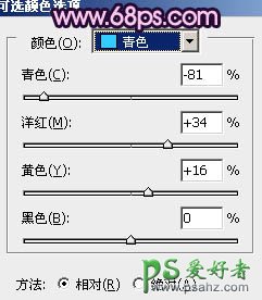 2、创建可选颜色调整图层,对绿,青进行调整,参数设置如图3,4,效果如图5。这一步是把树叶调绿一点。