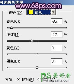 6、创建可选颜色调整图层,对黄,绿进行调整,参数设置如图14,15,确定后把蒙版填充黑色,用白色画笔把草地部分擦出来,效果如图16。