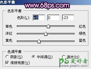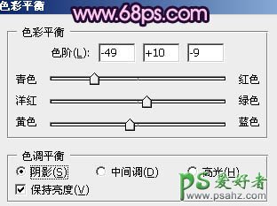8、创建色彩平衡调整图层,对阴影,中间调进行调整,参数设置如图18,19,效果如图20。这一步简单调整图片的层次感。