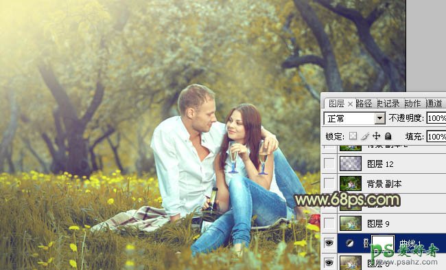 photoshop给草地上的欧美情侣图片调出粉黄艺术效果