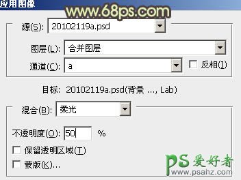 13、新建一个图层,盖印图层。选择菜单:图像 > 模式 > Lab颜色,选择不合拼。然后执行:图像 > 应用图像,参数设置如图23,效果如图24。Lab模式是给人物增加填色的最快方法。