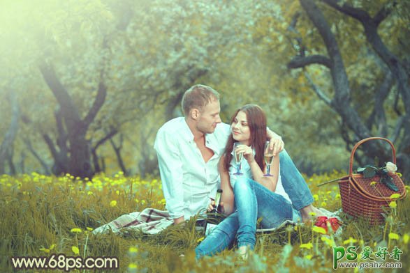 photoshop给草地上的欧美情侣图片调出粉黄艺术效果