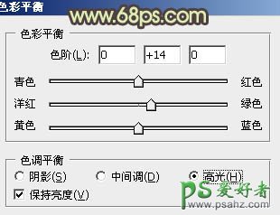 2、创建色彩平衡调整图层,对高光进行调整,参数设置如图4,效果如图5。这一步调整高光部分的颜色,整体稍微调亮一点。