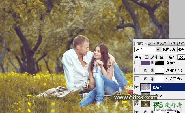 4、按Ctrl + Alt + ~ 调出高光选区,按Ctrl + Shift + I 反选,新建一个图层,填充颜色:#5B4275,混合模式改为“滤色”,不透明度改为:60%,效果如下图。这一步是图片增加一些蓝色补色。