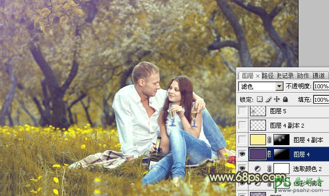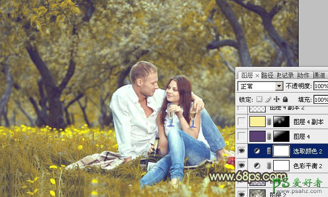 photoshop给草地上的欧美情侣图片调出粉黄艺术效果