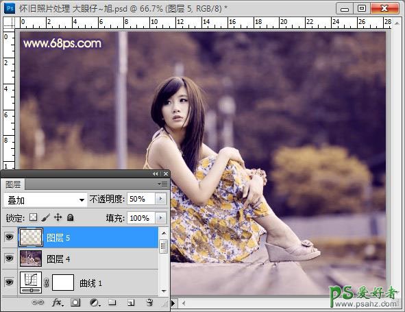 6、新建空白图层,并盖印空白图层,按CTRL+SHIFT+ALT+2(CS5版本的)调出图层的高光选区,并按CTRL+SHIFT+I执行反向选择,并新建空白图层,填充颜色(#d1c0a5),并设置图层的混合模式为叠加,图层的不透明度为50%,效果如图。