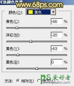 2、创建可选颜色调整图层,对黄色进行调整,参数设置如图2,效果如图3。这一步增强画面的暖色调。