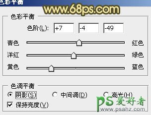 3、创建色彩平衡调整图层,对阴影、中间调、高光进行调整,参数设置如图4 - 6,效果如图7。这一步是加强橙色的浓度。