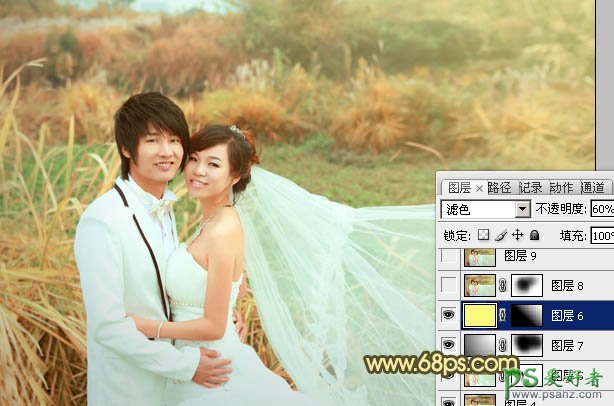 7、新建一个图层,填充颜色:#FAF97D,混合模式改为“滤色”,不透明度改为:60%,加上图层蒙版,只保留右上角,其它部分用黑色画笔擦掉。