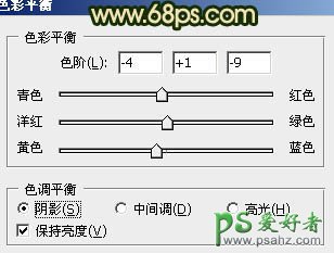 4、创建色彩平衡调整图层,对阴影及高光进行调整,参数设置如图12,13,效果如图14。